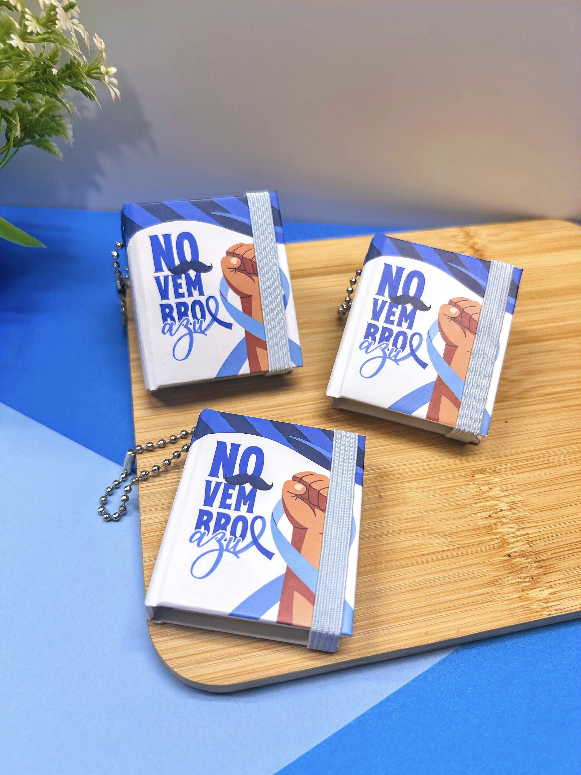 Nosso chaveiro Post-it Novembro Azul é um mini caderninho com capa dura, ideal para levar no bolso, na bolsa ou nas chaves.